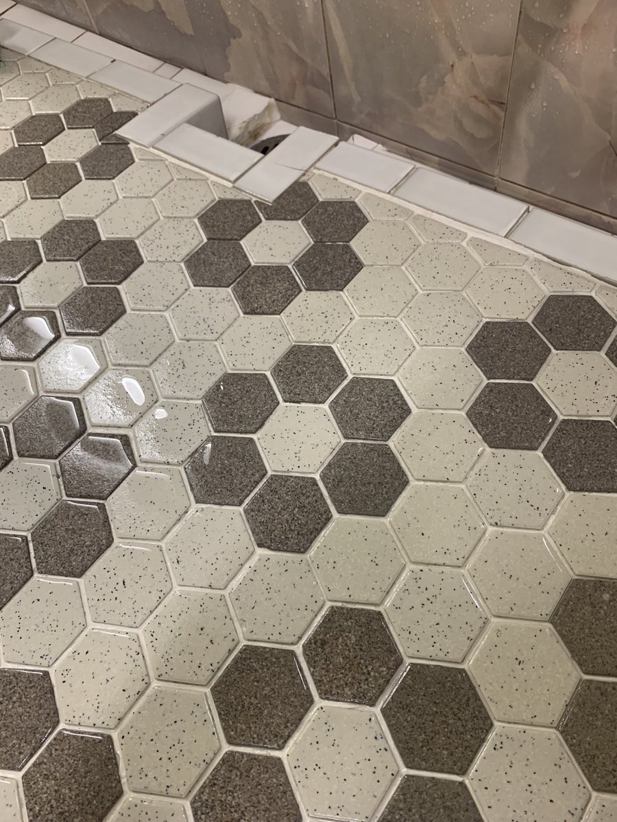 タイルの溝は拭き取れなかったのかピンクになっとる
